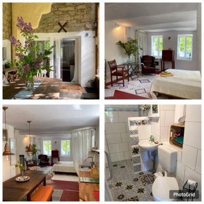 Direkt nebenan (ca. 4 meter entfernt) befindet sich eine Naturtoilette. Gäste können Küche, Bad und Toilette im Haus. mitbenutzen.